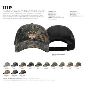This garment-washed, mesh back printed trucker cap is all about comfort and fit. A relaxed look makes it ideal for any activity, or doing nothing at all. Relaxed unstructured fit that is garment washed, with an adjustable snapback style. Sizes are OSFM. The Richardson 111P snapback style trucker caps come in 13 different color combinations with an embroidered logo with up to 5,000 stitches.